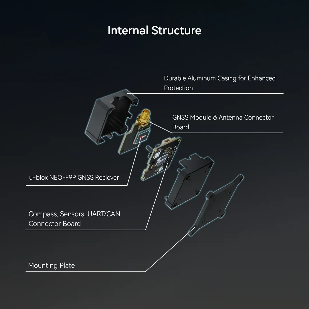 Es unterstützt den gleichzeitigen Empfang von GPS (L1 & L5), GLONASS, Galileo, BeiDou und QZSS-Signalen und bietet flexible Konnektivität in sowohl UART- als auch DroneCAN-Optionen. Die DroneCAN-Version enthält einen MCU, IMU und Barometer, die eine robuste Kommunikation und nahtlose Integration für fortschrittliche UAV-Systeme ermöglichen.