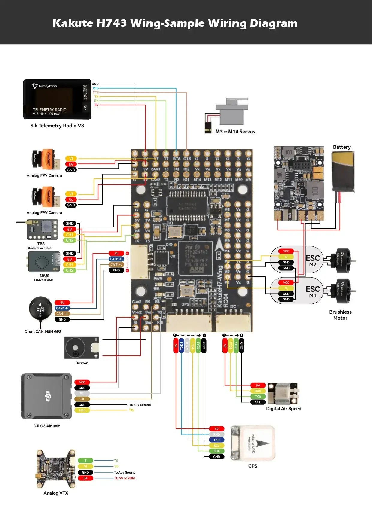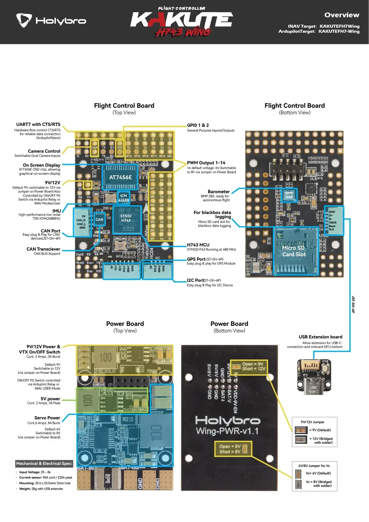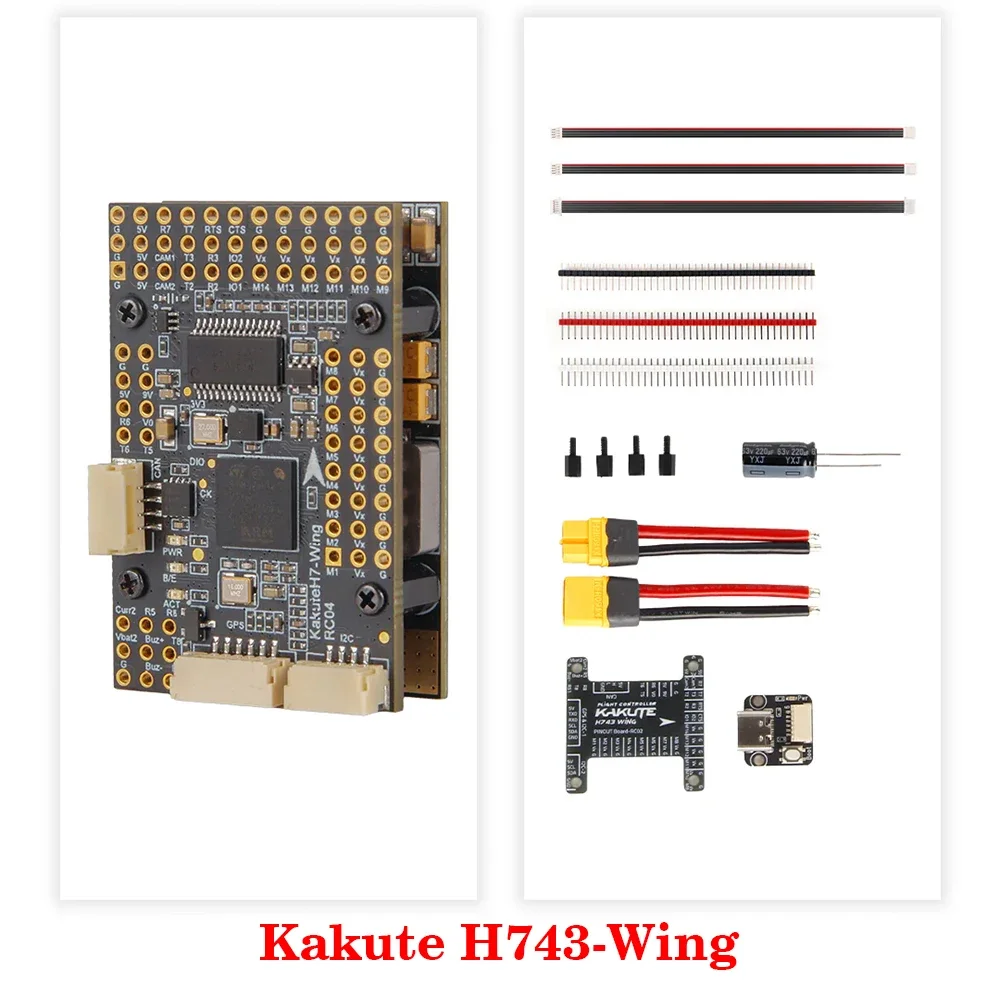 Der Holybro Kakute H743 Wing ist ein voll ausgestatteter Flugregler mit einem Layout, das speziell für Starrflügel- und VTOL-Anwendungen entwickelt wurde. Er verfügt über den STM32 H743 Prozessor mit 480 MHz und CAN Bus Unterstützung, sowie Dual-Kamera-Unterstützung & -Umschaltung, ON/OFF Pit Schalter, 5V, 6V/8V, 9V/12 BEC und Plug-and-Play GPS, CAN, I2C Ports.