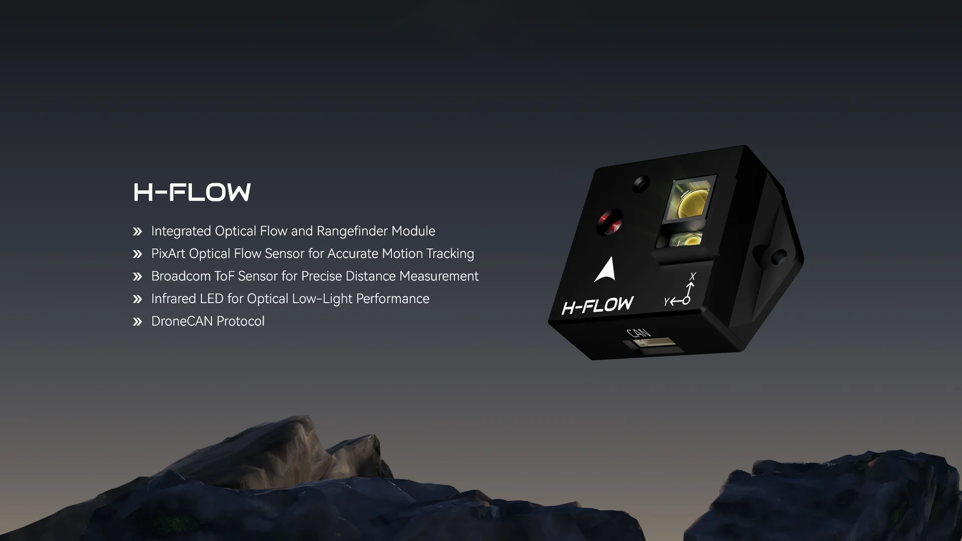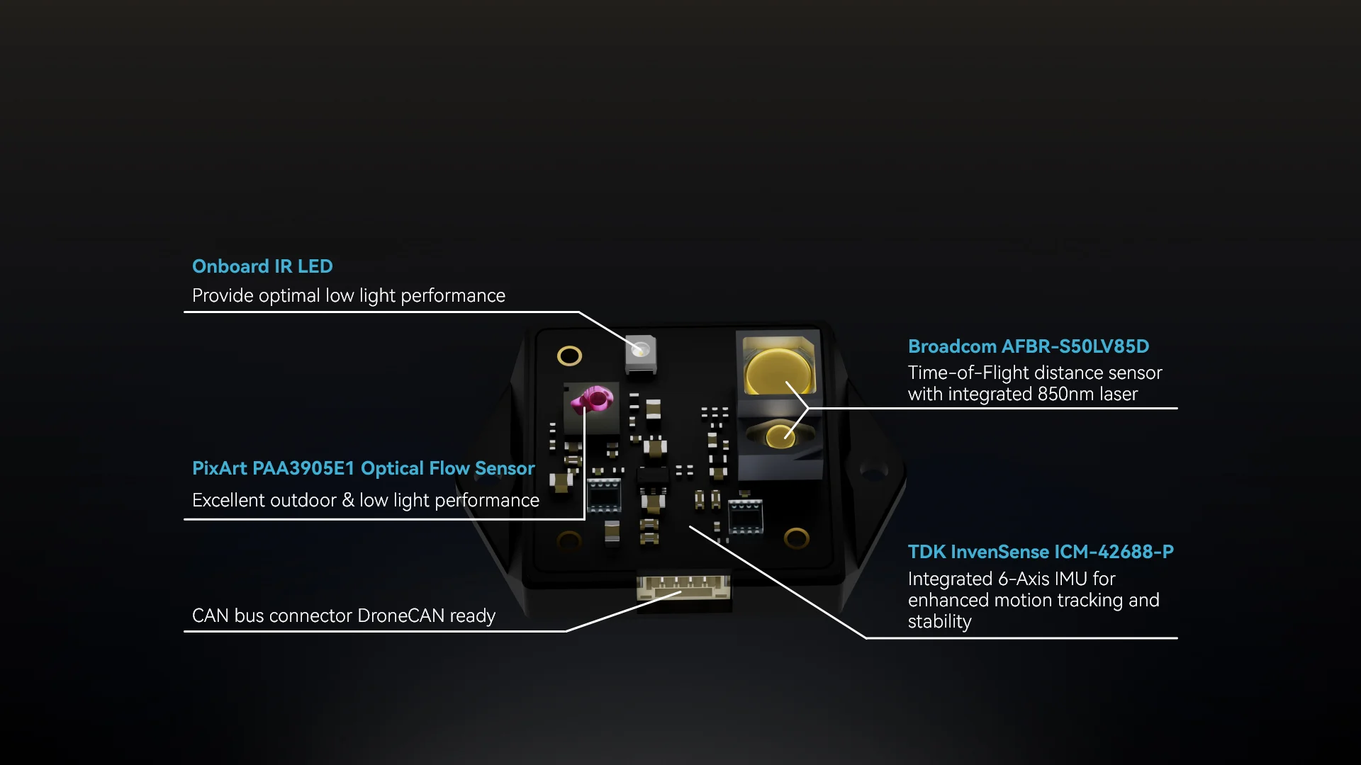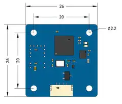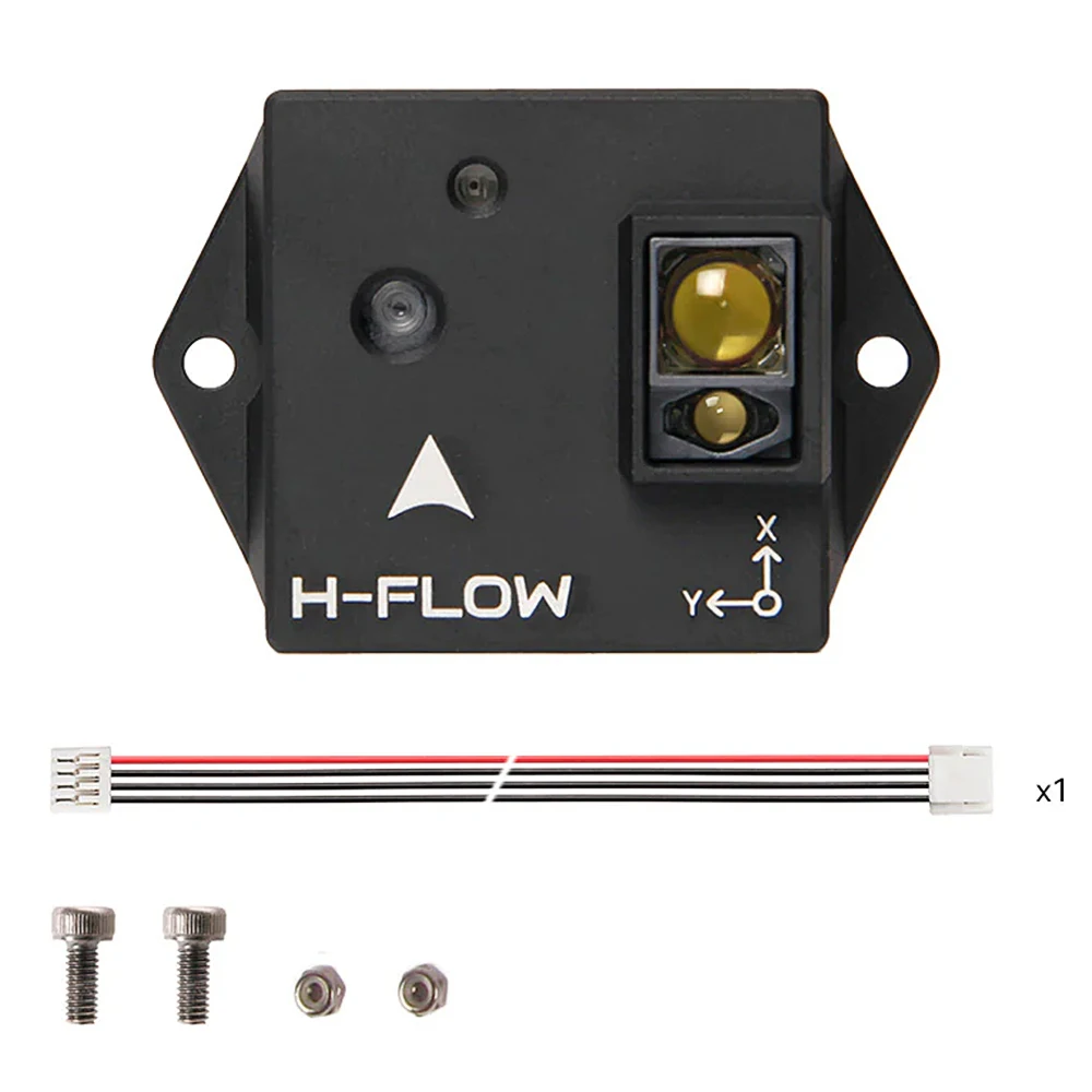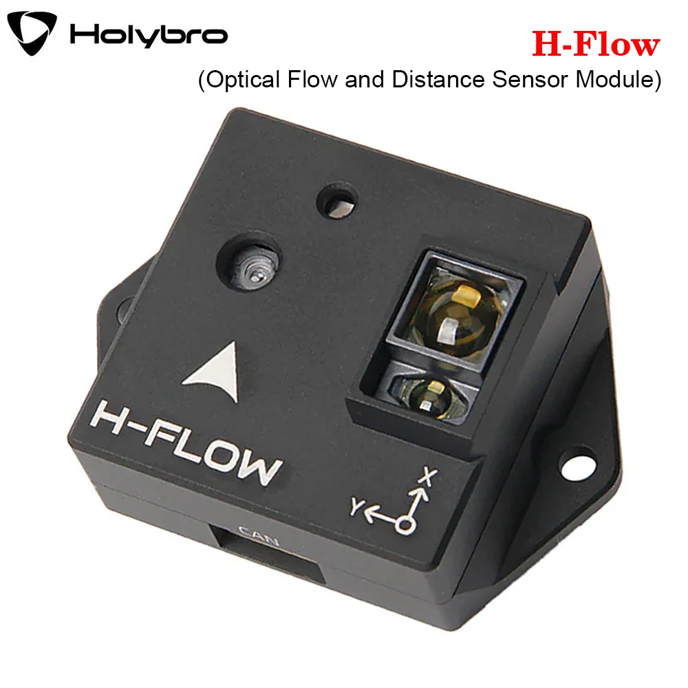 The Holybro H-Flow is a compact optical flow and distance sensor module that combines a PixArt PAA3905E1 optical flow sensor, a Broadcom AFBR-S50LV85D distance sensor, and an InvenSense ICM-42688-P 6-axis IMU. This all-in-one design simplifies installation, while the onboard infrared LED enhances visibility in low-light conditions.