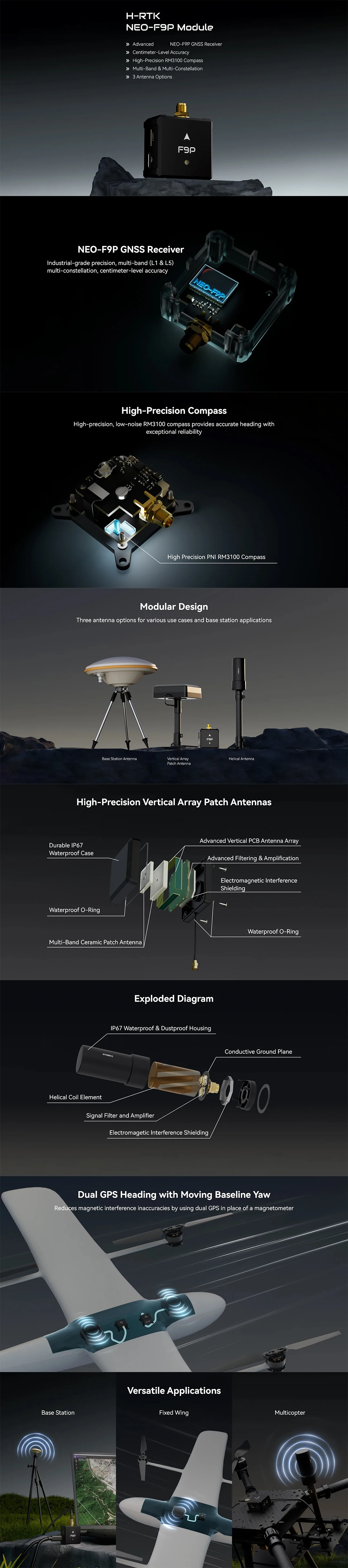 The H-RTK NEO-F9P GPS integrates the advanced u-blox NEO-F9P GNSS receiver, high-precision RM3100 compass, and a tri-color LED indicator. This high-precision system delivers multi-band RTK capabilities with rapid convergence times, reliable performance, and fast update rates, making it ideal for highly dynamic, high-volume applications that require centimeter-level accuracy. Multiple antenna options are available to suit diverse use cases.