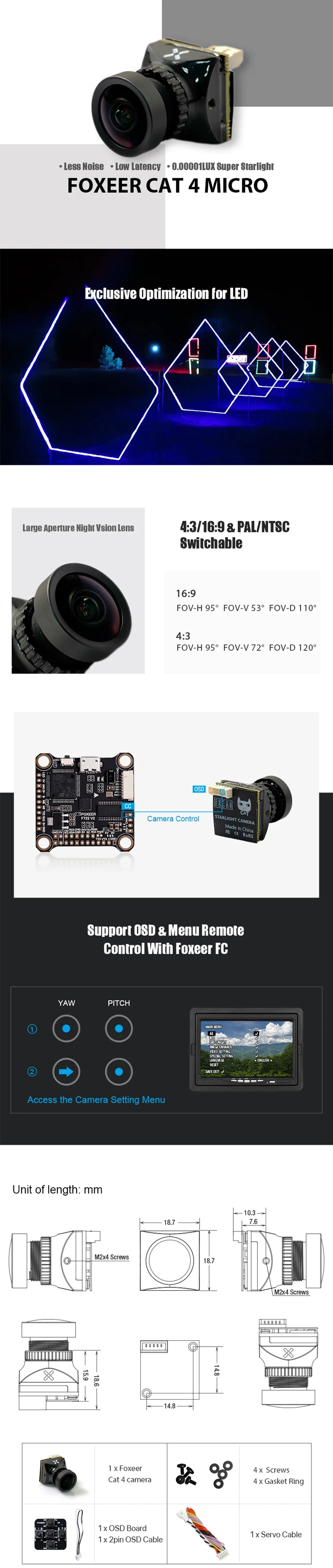 FOV:4:3 FOV-H: 95°, FOV-V: 72°; FOV-D:120° / 16:9 FOV-H: 95°, FOV-V: 53°; FOV-D:110°