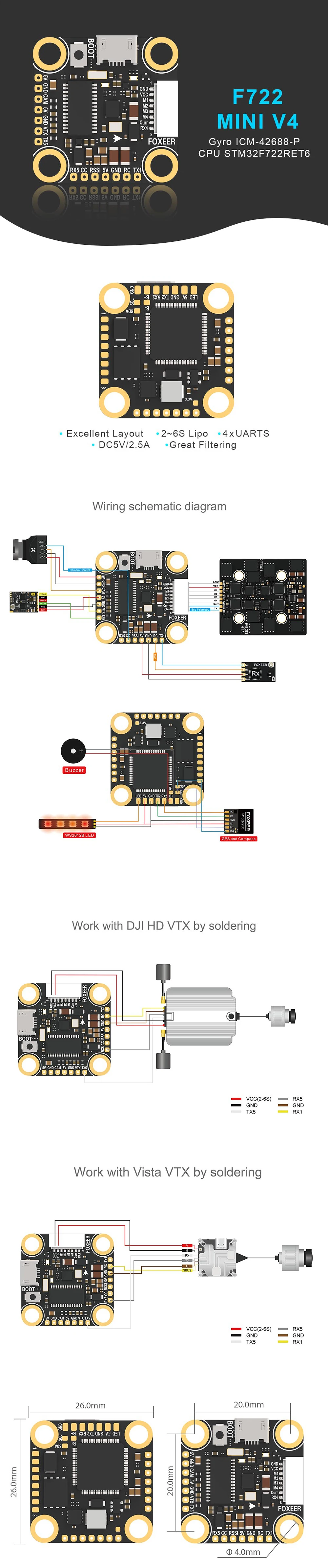 FOXEER F722 Mini V4 Flight Controller ICM42688, OSD, Black Box 16M, BEC DC5V/2.5A, 2-6S Lipo for RC FPV Drone